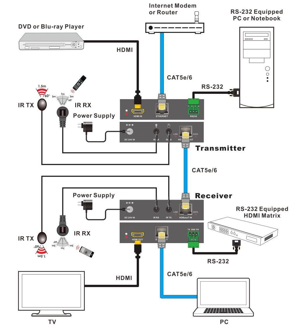 The HDMI Extender over CAT5E/6 is a tool for extending your HDMI signal over long distances to a compatible display. It is designed to convert HDMI signal to standard HDBaseT signal and transmit by Internet cable. It also supports Transfer Bidirectional Infrared control signal together with the HDMI signal, so you can control the Source in the Sink side which is 70 meters outside, also you can control the Sink in the Source side which is 70 meters outside using the HDMI Extender.