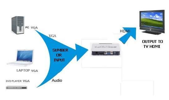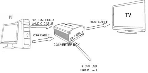 - Используйте кабель VGA, кабель AV или оптический кабель для подключения входного источника видеосигнала и выход аудио с конвертером.