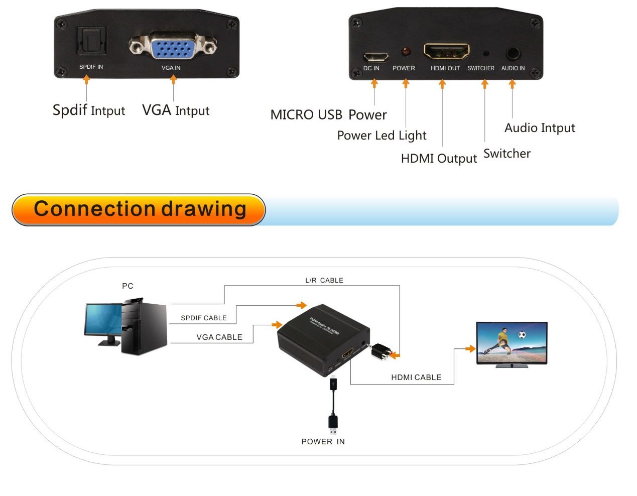 Этот VGA к HDMI конвертер имеет один VGA + аудио вход SPDIF или один VGA + один аналоговый аудио вход и один выход HDMI. Вы можете легко изменить VGA + SPDIF или VGA + аналоговый к сигналу HD для воспроизведения на дисплее HD.